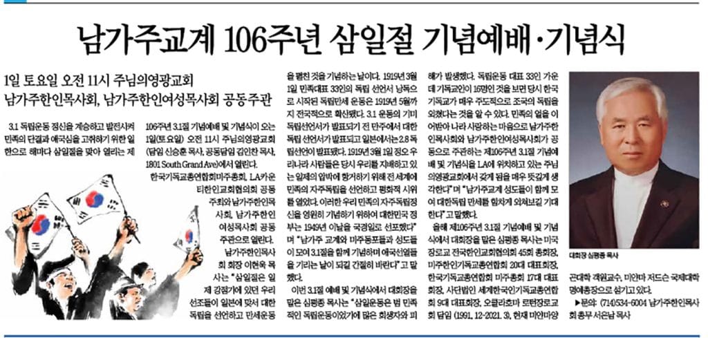 제106주년 3.1절 기념예배 및 기념식 공동주관: 남가주한인목사회/ 남가주한인여성목사회-대회장 심평종 목사